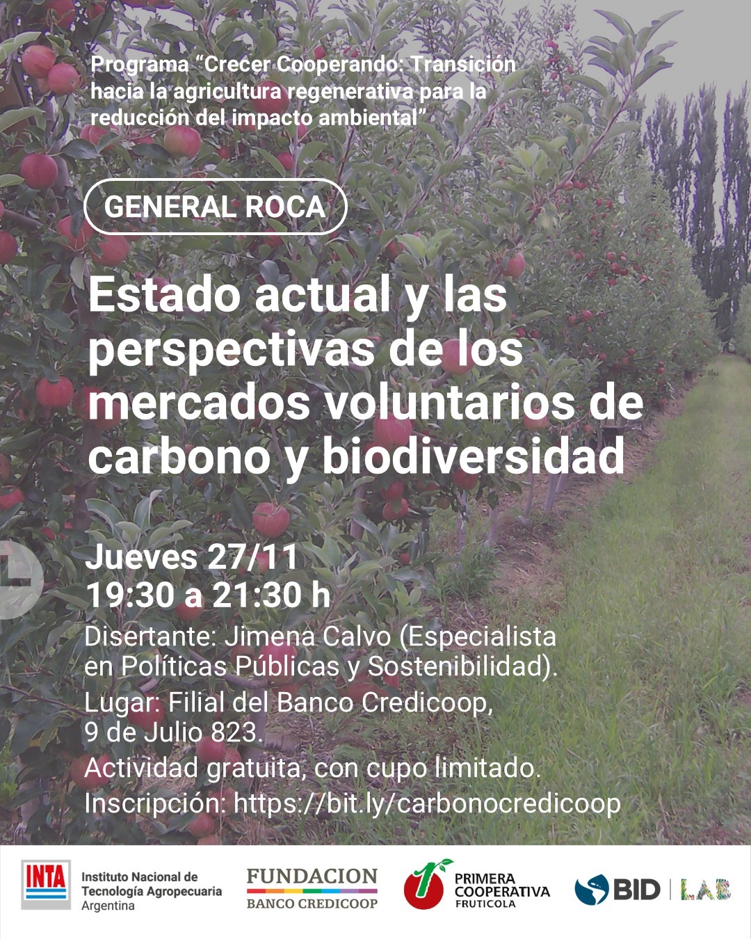 La Fundación del Banco Credicoop y el INTA Alto Valle invitan a la presentación del informe “Estado actual y las perspectivas de los mercados voluntarios de carbono y biodiversidad: oportunidades y barreras que enfrentan los productores para integrarse a estos mercados”, que se realizará el jueves 27 de noviembre en la filial General Roca del Banco Credicoop (9 de Julio 823, General Roca) de 19:30 a 21:30.