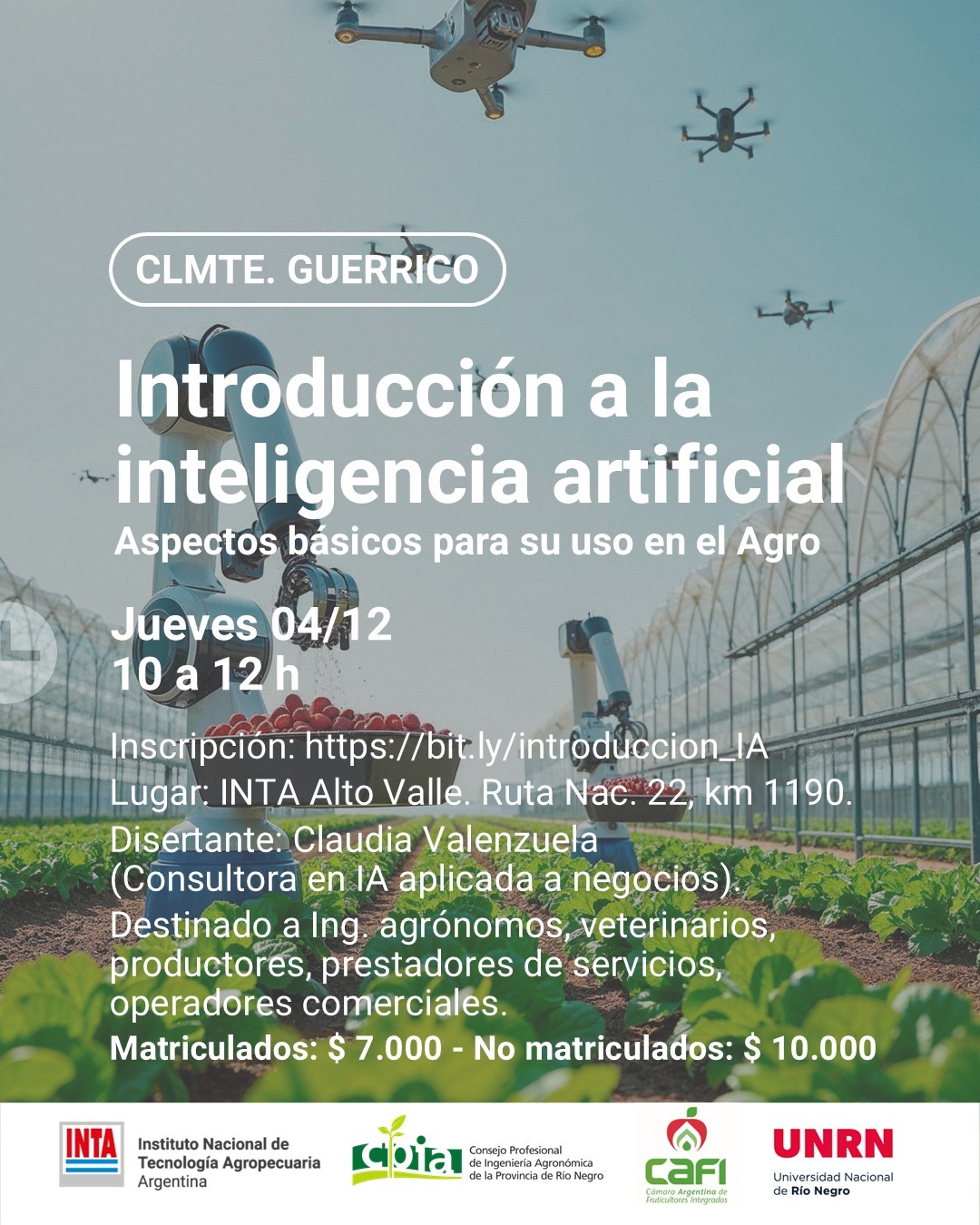 La actividad estará a cargo de Claudia Valenzuela, consultora en inteligencia artificial aplicada a negocios, quien abordará herramientas, alcances y oportunidades que estas tecnologías ofrecen para optimizar procesos en el sector agropecuario.