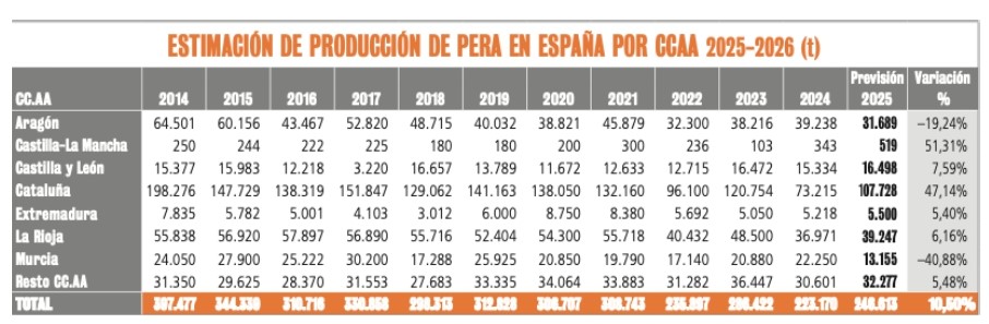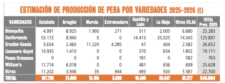 En el caso de la pera, la variedad Conferencia representará algo más de la mitad de la producción, con 125.897 toneladas, lo que supone un incremento del 25% respecto al año anterior. Otras variedades presentan evoluciones dispares como Ercolini-Coscia: 26.652 toneladas (-21,4%), Blanquilla: 25.283 toneladas (-10,9%) y William’s: 25.628 toneladas, que por primera vez superará a la Blanquilla en volumen.