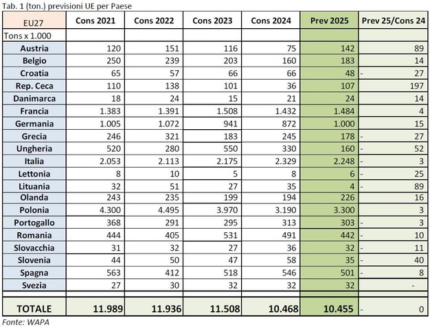 La Tabla 2 muestra las previsiones de producción europea desglosadas por variedad.
