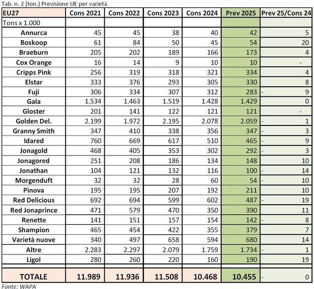 Hasta el momento, se estima que la cantidad de manzanas destinadas al mercado en fresco será de 1.958.511 toneladas, una ligera disminución respecto al año pasado (-2%), pero esencialmente en línea con la media de los últimos cuatro años.