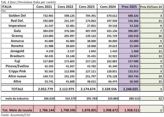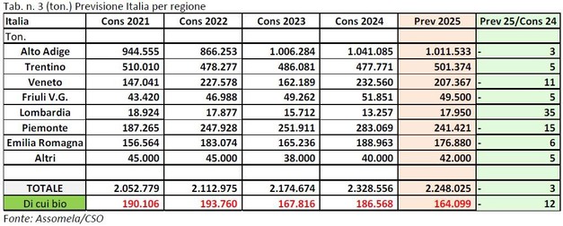 En Italia, la producción total se estima en 2.248.025 toneladas, una disminución del 3% en comparación con el año pasado ( Tabla 3 ). A nivel regional, se espera que la producción aumente en Trentino (+5%), mientras que se pronostica una ligera disminución en Alto Adige (-3%) y en la mayoría de las demás regiones. La disminución esperada es particularmente significativa en Piamonte (-15%), después de una temporada 2024 caracterizada por altos rendimientos. En Véneto, se espera que la producción disminuya un 11% en comparación con 2024, también debido a los daños causados por el granizo. Se pronostica una ligera disminución en Emilia-Romaña en comparación con 2024 (-6%), al igual que en Friuli (-5%).