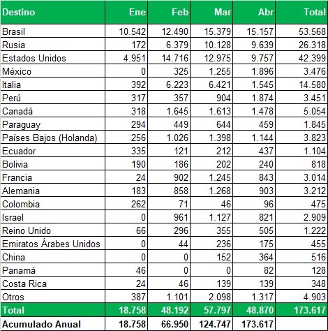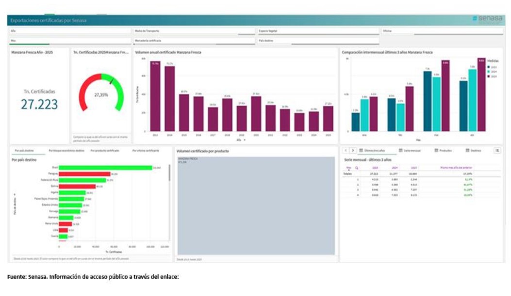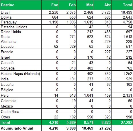 Exportaciones de Río Negro y Neuquén en toneladas, por país de destino y mes