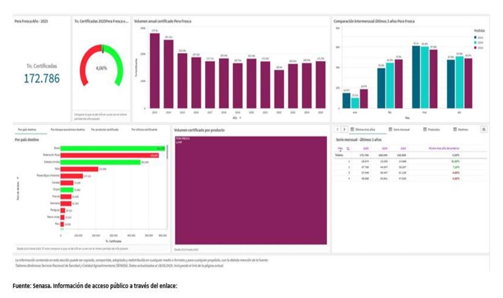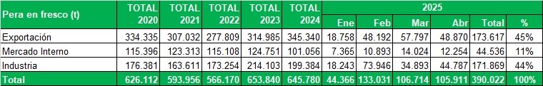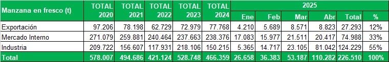 Exportaciones, mercado interno e industrialización, de Río Negro y Neuquén, en toneladas por mes