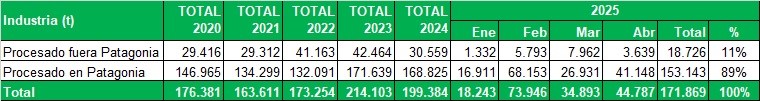 Industrialización de Río Negro y Neuquén, procesado fuera y dentro de Patagonia, en toneladas por mes