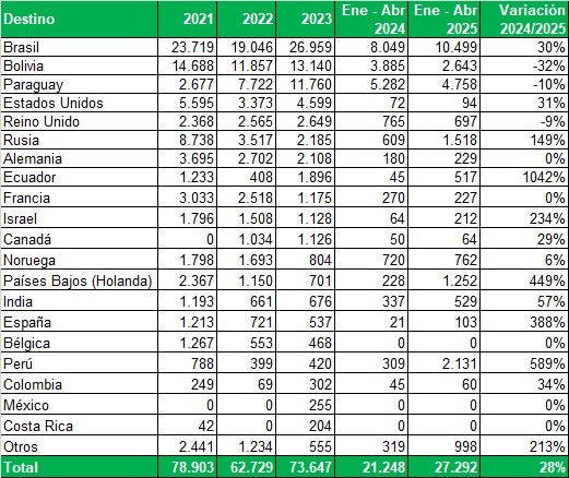 Exportaciones de Río Negro y Neuquén en toneladas, por país de destino, año, mes y variación