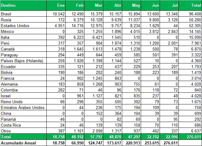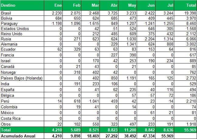 Exportaciones de Río Negro y Neuquén en toneladas, por país de destino y mes