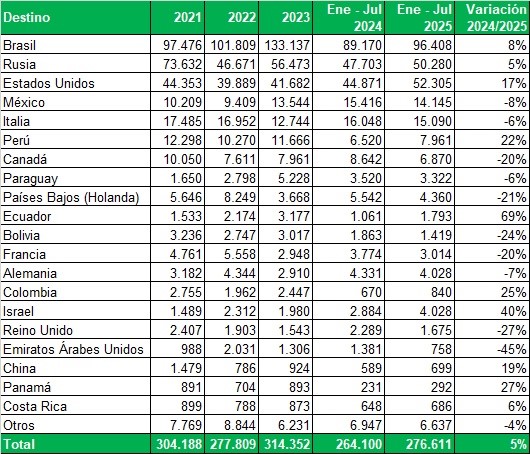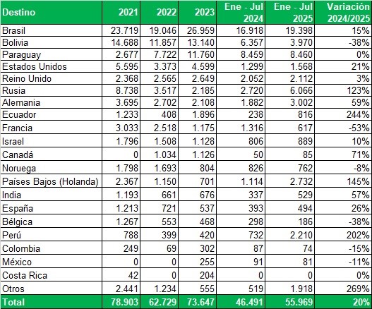 Exportaciones de Río Negro y Neuquén en toneladas, por país de destino, año, mes y variación