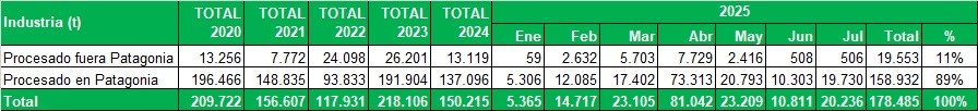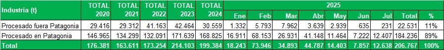 Industrialización de Río Negro y Neuquén, procesado fuera y dentro de Patagonia, en toneladas por mes