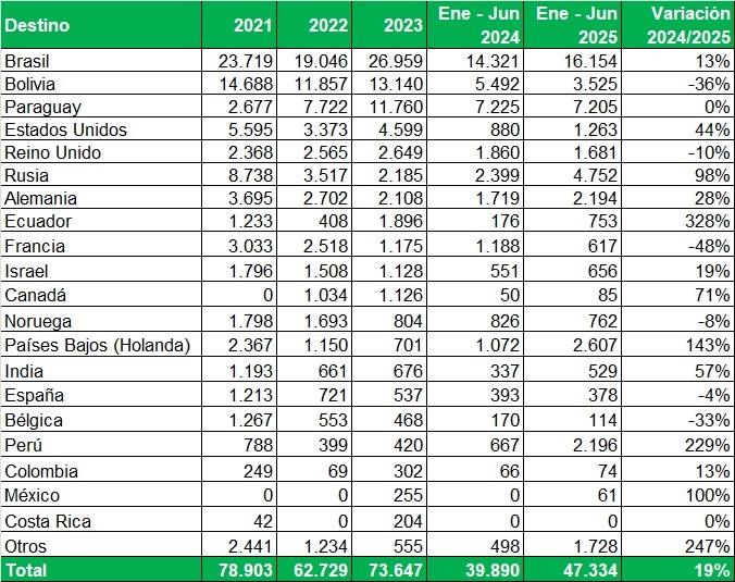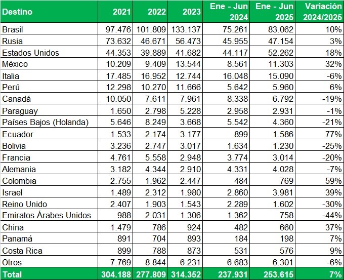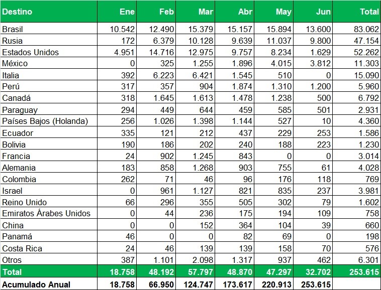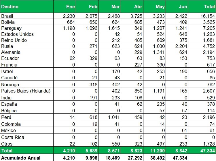 Exportaciones de Río Negro y Neuquén en toneladas, por país de destino y mes