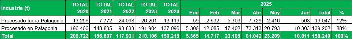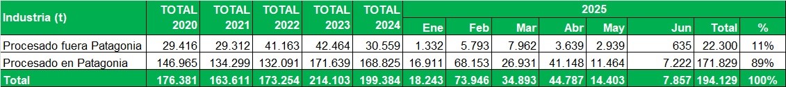 Industrialización de Río Negro y Neuquén, procesado fuera y dentro de Patagonia, en toneladas por mes
