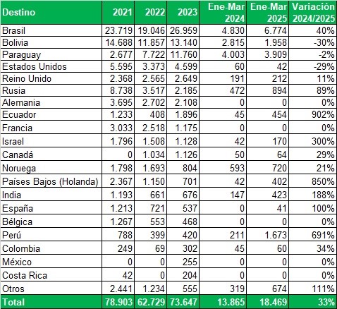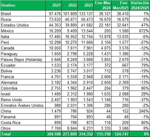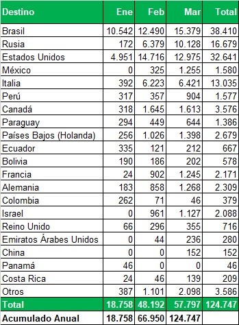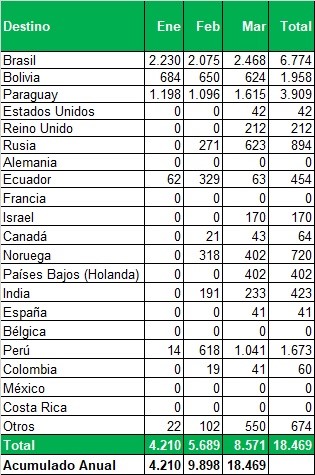 Exportaciones de Río Negro y Neuquén en toneladas, por país de destino y mes