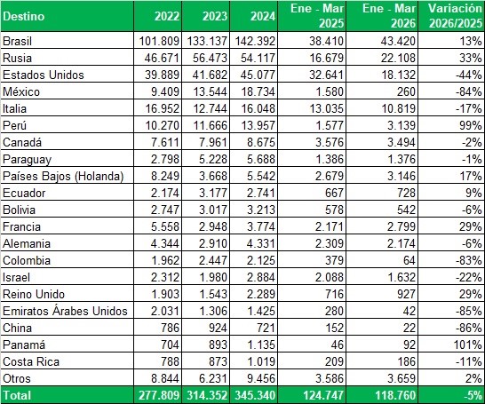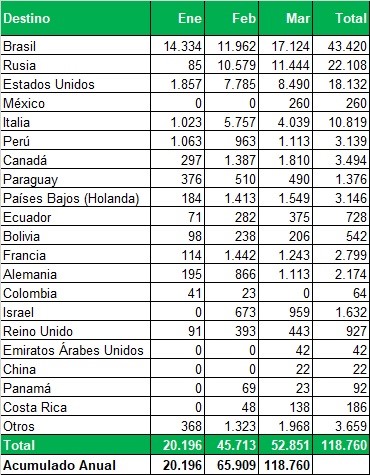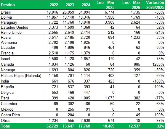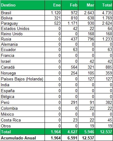 Exportaciones de Río Negro y Neuquén en toneladas, por país de destino y mes