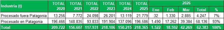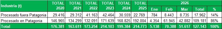 Industrialización de Río Negro y Neuquén, procesado fuera y dentro de Patagonia, en toneladas por mes
