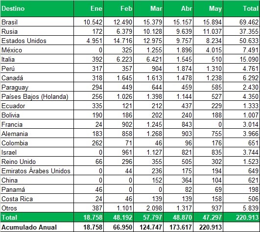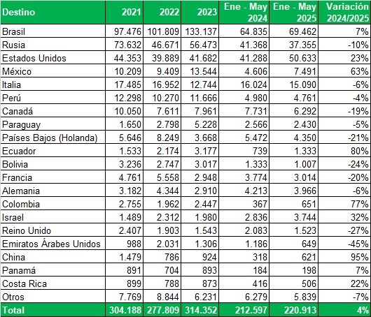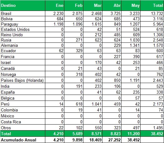 Exportaciones de Río Negro y Neuquén en toneladas, por país de destino y mes