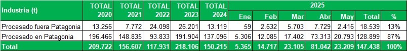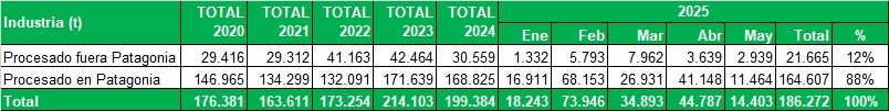 Industrialización de Río Negro y Neuquén, procesado fuera y dentro de Patagonia, en toneladas por mes