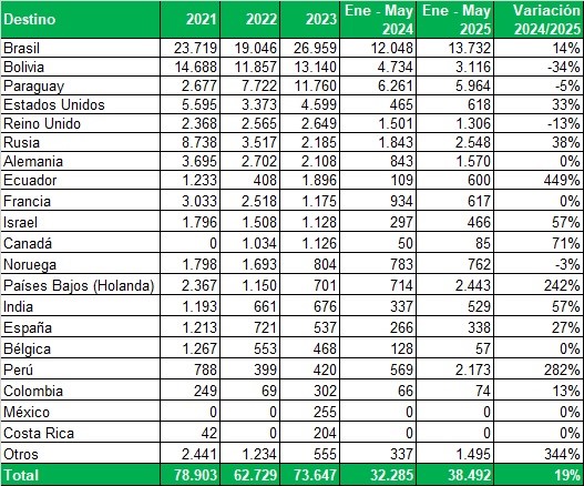 Exportaciones de Río Negro y Neuquén en toneladas, por país de destino, año, mes y variación