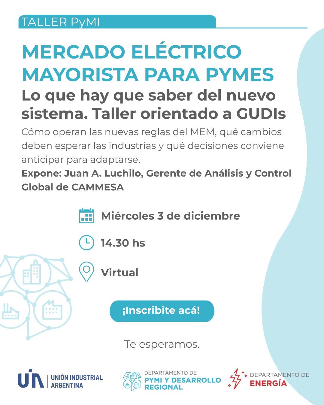 Con la Resolución 400 de la Secretaría de Energía de la Nación, el Mercado Eléctrico Mayorista cambió sustancialmente. Te invitamos a un taller para pequeñas y medianas industrias que sean GUDI: Grandes Usuarios del Distribuidor, es decir con un consumo eléctrico mayor o igual a 300kW. Allí vamos a revisar los principales cambios y la ruta pyme para adaptarse.