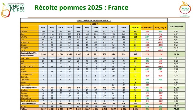 La previsión nacional de manzanas es de 1,485 millones de toneladas, un 4 % más que en 2024 y un 3 % más que la media de los últimos cinco años. La producción es «ligeramente superior a la media, sin llegar a ser excesiva», explica Vincent Guérin, responsable de asuntos económicos de la ANPP, añadiendo que es probable que las previsiones cambien debido a la presión del pulgón del fresno, muy fuerte este año. Las manzanas Golden se sitúan por encima de la media, pero ligeramente por debajo de la del año pasado. La variedad Gala ha recuperado su producción normal, al igual que la Granny Smith tras una caída el año pasado. Las variedades internacionales se mantienen estables (-1 %). Las variedades Club* (Cosmic Crisp, Pink Lady, etc.) siguen creciendo (+2 %), hasta las 300 000 toneladas, gracias a los nuevos huertos. Por último, las manzanas llamadas «terroir» muestran resultados dispares. Las manzanas Chanteclerc y Belchard se mantienen en línea con la media, con una cosecha mejor que en 2024, mientras que la variedad Canadá se mantiene más débil.
