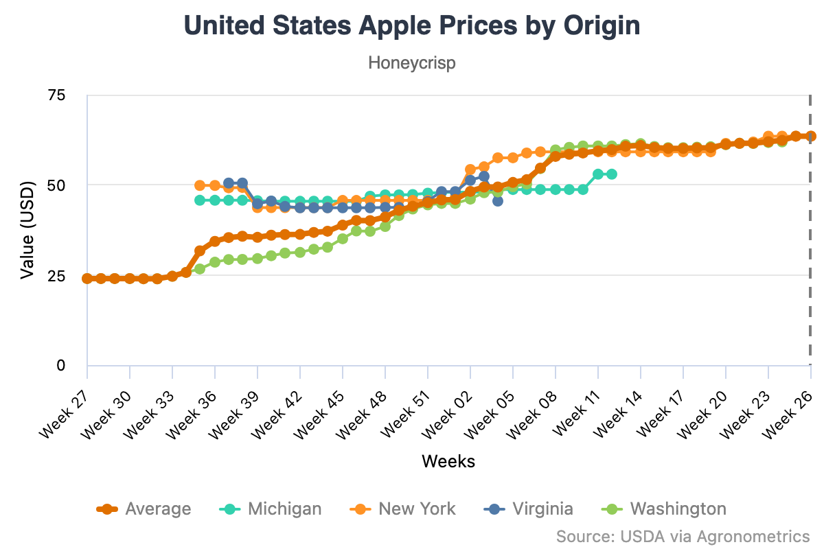 Washington, el principal estado productor de manzanas del país, ha enfrentado contratiempos climáticos que han afectado significativamente su producción de Honeycrisp. Informes del sector indican que los volúmenes de Honeycrisp de Washington han disminuido aproximadamente un 32% en comparación con el año pasado. Esto por sí solo habría impulsado los precios al alza, pero se ve agravado por la reducción de la producción en el Medio Oeste y la oferta limitada proveniente de otras regiones productoras de EE. UU.