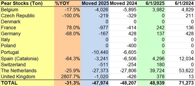 En contraste, Francia y el Reino Unido reportaron aumentos notables en las existencias de pera. Francia experimentó un aumento interanual del 78%, pasando de 136 toneladas en 2024 a 242 toneladas en 2025. El Reino Unido registró el mayor crecimiento relativo, con existencias que aumentaron de 13 toneladas en 2024 a 378 toneladas en 2025, un incremento del 2807,7%. Sin embargo, la tendencia regional general sigue siendo negativa, con varios países, como Bélgica, Portugal, Polonia y la República Checa, mostrando niveles de existencias reducidos o eliminados en comparación con el año anterior.