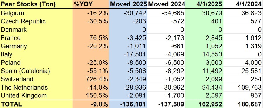 A pesar del descenso general, algunos países registraron importantes aumentos interanuales. Suiza registró el mayor aumento porcentual, del 726,4%, pasando de 254 toneladas en 2024 a 2.099 toneladas en 2025. El Reino Unido también duplicó con creces sus existencias, pasando de 957 toneladas a 2.397 toneladas, un aumento del 150,5%. Francia registró un aumento del 76,5%, alcanzando las 2.845 toneladas. Sin embargo, estos aumentos no fueron suficientes para compensar las reducciones generalizadas en toda la región, lo que contribuyó a la disminución general de las existencias totales de peras.