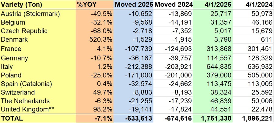 Durante el mismo período, varios países registraron un aumento en las existencias de manzanas. Dinamarca registró el mayor crecimiento respecto al año anterior, con un incremento del 520,3%, pasando de 611 a 3.790 toneladas. Suiza también registró un aumento del 49,7%, mientras que las existencias del Reino Unido casi se duplicaron, pasando de 22.478 toneladas a 44.551 toneladas. Italia mantuvo el mayor volumen total de existencias, con 644.835 toneladas, ligeramente más que las 636.932 toneladas del año anterior. A pesar de estos aumentos, no fueron suficientes para compensar el declive regional más amplio.